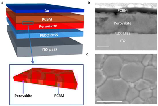 Perovskite solar cell structure: (a) schematic representation of the perovskite solar cell’s architecture; the zoomed-in diagram shows the hybrid material created. (b) Perovskite solar cells were grown with PCMB assistance and TEM cross-section view. Scale bar: 100 nm. (c) The view from above SEM image of a perovskite film that was grown using a CB-assisted process in conditions similar to those for PCMB-assisted growth. Scale bar: 1 µm [90].