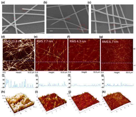 30° tilt view SEM images of (a) 0.5 wt% overcoating of pristine AgNW networks and AgNW composite (b) and 1 wt% (c) Chi-AsA. The scale bar is 100 nm. Pristine AgNW networks’ AFM height images and corresponding section profiles. (d) 0.5% Chi-AsA overcoated on AgNW composite. (e) 1 wt% Chi-AsA (f) and (g) scan size over 10 µm × 10 µm (d–f) and 50 µm × 50 µm (g). (h–k) AFM 3D images corresponding to (d–g) [124].