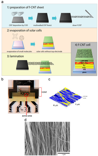 (a) Fabrication process f-CNT cell (b) a photograph of an f-CNT cell (c) AFM 4 × 4 µm (d) SEM image of f-CNT sheet on the top of solar cell [132].