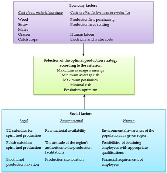 Increasing environmental protection requirements in Poland and the EU make it necessary to look for new possibilities for engine fuel production. One fuel meeting environmental safety conditions could be second-generation bioethanol produced from waste materials, i.e., lignocellulose, straw, maize grasses, or catch crops. Factors determining the bioethanol production efficacy include economic and social aspects, as well as the selection of the optimum production strategy. To evaluate the most important factors that can affect the possibilities of bioethanol production in Poland, the expert approach has been applied. Based on the methodology proposed by Yevlanov et al. [19], the minimum number of required experts was determined at 41. To provide a set of data with the highest potential statistical significance, a group of 96 experts was selected based on criteria discussed in detail in the literature [18]. The experts who participated in the survey were the management staff of companies specializing in the production of alternative energy sources in Poland, as well as faculty members from Polish universities working in applied biochemical engineering and energy engineering. The selected experts have either practical experience or have conducted broad studies on renewable spirit fuel production. In the group of factors affecting the possibilities of second-generation bioethanol production in Poland, experts distinguished well-known and structured economic factors, such as the costs of raw material purchase and direct production factors (production line purchase, labor, cost of electricity, and water). Interestingly, a wide group of legal, social, and human factors was also identified (Figure 3).