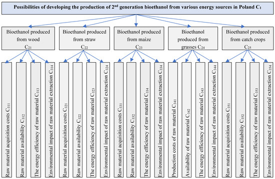 Input elements for event tree analysis (ETA) assessing the main criteria (C) of the development of generation II bioethanol production from various energy sources in Poland. The presented tree shows a top-down, inductive procedure structuring the bioethanol production possibilities from different raw materials. C1—initial event of bioethanol production possibilities; C2X—level of factors assessing the various substrates for bioethanol production; C3X—level of factors assessing the cost, technical, and environmental aspects of bioethanol production from a given raw material.