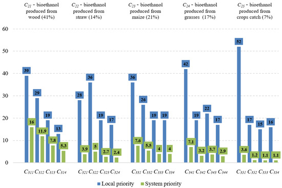Assessment of the significance of level III factors conditioning the development of second-generation bioethanol production in Poland. Local priorities were determined, characterizing their significance in the given study group in level III factors (shown in blue bars). For each factor, system priority values were determined, which denoted their share in the hierarchy of significance of the main objective (shown in the green bars). The system priority value was calculated by multiplying the value of the local priority at a given level of the factor by the value of the local priority of the higher-level factor located in the given branch of the event tree.