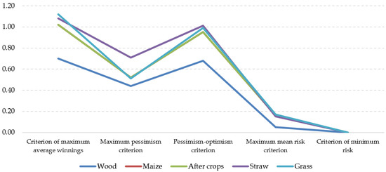 The optimum strategy of bioethanol production in Poland was adopted as the one with the largest number of indications in the individual criteria with the minimum identified production costs or minimum risk of increase in production costs depending on changes in the economic and social environment. After the comparison of individual strategies, the final strategy of bioethanol production should be based on the minimal possible production costs and minimal possible risk of production costs increase. The data presented in Figure 6 indicate that the production of second-generation bioethanol in Poland from wood waste represents the optimum production scenario. According to three main choice criteria, i.e., the criterion of maximum win, the criterion of maximum risk, and the criterion of optimism-pessimism, the possible bioethanol unit production costs represent the lowest value among all analyzed raw materials. Furthermore, according to the fourth criterion—maximum average risk—the production of second-generation bioethanol seems to be optimal. According to the fifth criterion, in the changing economic and social environments analyzed, the production of this fuel is equivalent to that of all the raw materials analyzed. The production of bioethanol from other feedstocks such as maize, catch crops, straw, and grasses is very similar in terms of the possibility of changes in the costs of their production, as well as the size of the risk of these changes, according to all five criteria of individual choice.