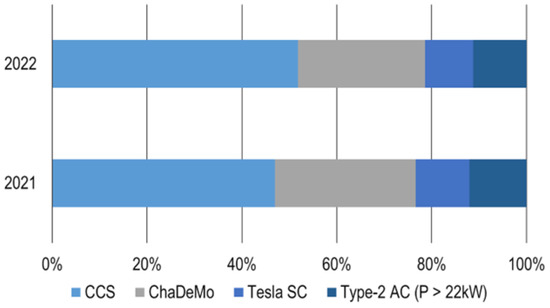 Among the types of EV charging connectors available, CSS-type connectors account for the largest share. CSS connectors are half of all available connectors at public charging points in the EU. CHAdeMO plugs also have a large share (about 30%), as a result of the large number of Japanese and Korean EVs used by Europeans [44].