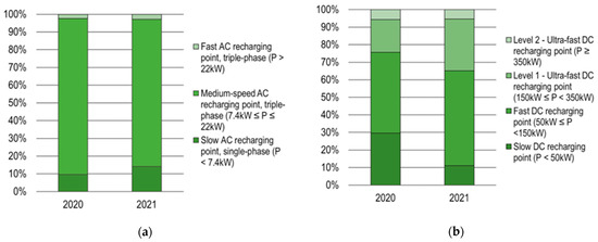 When analyzing publicly available DC charging points, fast chargers with a power range of 50 kW to 150 kW are the most numerous (Figure 3b). They account for half of the publicly available DC chargers. The number of ultra-fast DC chargers is growing. Due to the charging power, there are two types of ultra-fast chargers: level 1—with a power in the range of 150 kW to 350 kW, and level 2—with a charging power above 350 kW. Among all publicly available DC charging points, their share was 24% in 2020 and 35% in 2021, respectively.