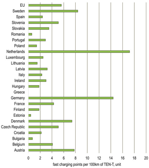 Another indicator of the availability of charging infrastructure for electric vehicles is the ratio of the number of charging points per 100 km of roads within the TEN-T network. Trans-European Network-Transport (TEN-T) is a trans-European road network that was established by a decision of the European Parliament and the Council on 23 July 1996 [65]. The current TEN-T policy is based on Regulation 1315/2013 of the European Parliament and of the Council [66]. The TEN-T network is part of the Trans-European Networks (TEN) program, which assumes the development of road, rail, water and air transport corridors in the European Union countries, facilitating and accelerating the transport of goods and greater mobility of passengers. An effectively functioning transport system within the EU contributes to the improvement of the functioning of the single internal market, stimulates the economic growth of the region, and increases the competitiveness of individual member states and the entire EU on a global scale. The TEN-T network is constantly being developed, modernized and adapted to the appropriate infrastructure. Green Deal for Europe places particular emphasis on the development of infrastructure for alternative vehicles. Figure 6 shows the number of fast combined charging system (CCS) chargers for every 100 km of TEN-T network in European Union countries [45].