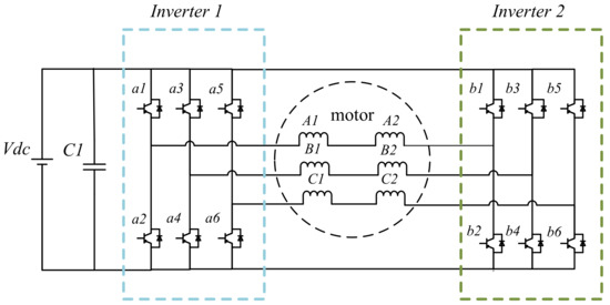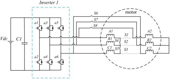 - Tian, B.; Zhang, Z.; Wei, J.; Lipo, T.A. Investigation of dual-inverter-fed drives for permanent magnet synchronous motor with winding switching. In Proceedings of the IECON 2014—40th Annual Conference of the IEEE Industrial Electronics Society, Dallas, TX, USA, 29 October 2014–1 November 2014; pp. 709–714. [Google Scholar] [CrossRef]