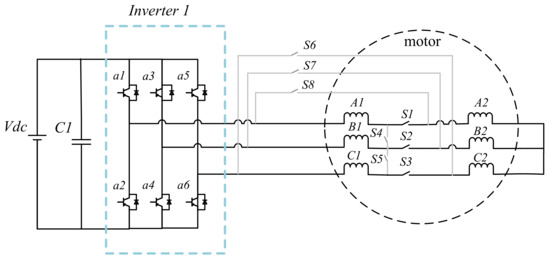 This paper proposed a new reconfigurable topology that contains one inverter with eight switches. The structure of the proposed topologies is shown in Figure 3 and Figure 4. When the speed is lower than the base speed, only S1, S2, and S3 are closed, and the PMSM operates as a traditional PMSM control with . When the speed of the generator is higher than the base speed, S1, S2, and S3 switch off and S4, S5, S6, S7, and S8 switch on, as shown in Figure 4. Half of the motor windings are operated in parallel, controlled by the same inverter.