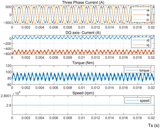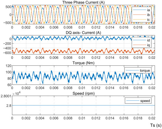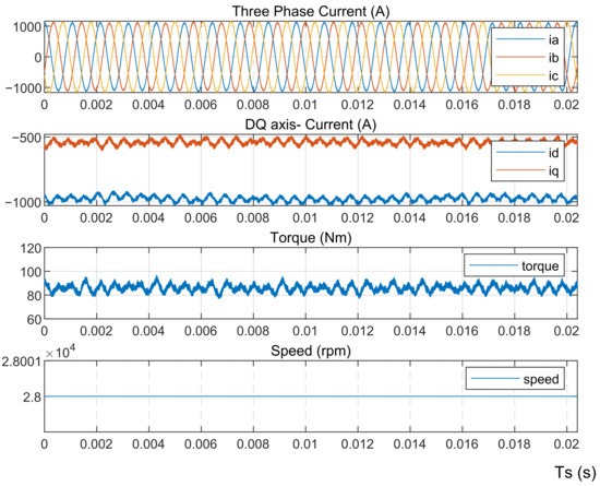 To verify the high performance of the reconfigurable topology, several significant analysis results are summarized as listed in Table 2. The control method of each model is introduced, and the constant output power and constant input rotor speed are adopted as the main specifications. The three-phase current RMS value and dq axis currents can be obtained during the experiments. Electric power losses include the conduction losses, and the switching losses of all semiconductors and external switches are obtained with thermal analysis. Converter efficiency is defined by comparing the electric control system input power to its output power. redDifferent from the analytical equations, the simulation model considers the stator resistance and thus there’s a difference between mechanical and electrical power that is defined as stator losses. Motor efficiency is determined by comparing the input power of the generator to its output power. The experimental results of the four models, including the three-phase current, the d-axis, the q-axis current, and speed, are displayed in Figure 6, Figure 7, Figure 8 and Figure 9, respectively . Ts is the sampling period of the HIL experiments.