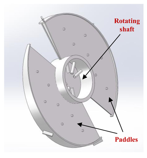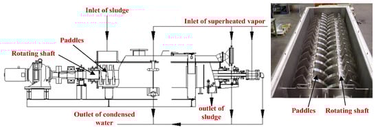 Compared to other drying machines, the paddle dryer is one of the most widely used pieces of equipment in sludge drying, owing to its low energy consumption and cost [4]. A paddle dryer is shown schematically in Figure 1, composed of an outer shell, electric motors, rotating shaft, and an adequate number of paddles. The paddles are made of fan-like metal plates with a hollow space inside and are vertically welded on the surface of a rotating shaft, as shown in Figure 2. The rotating shaft is also hollow, and several pipes are installed to connect the inner spaces between the paddles and rotating shaft. As the paddle dryer is working, sludge with high water content is transported into the space between the outer shell and paddles. Meanwhile, superheated vapor enters the interior of the rotating shaft and then flows into the interior of the paddles. The vapor and sludge do not touch each other. The heat in the high-temperature vapor is transferred from the internal to the external side of the paddles, evaporating the water and drying the sludge [5]. In addition, the rotating shaft is always rotating at a constant speed to stir the sludge and enhance the heat transfer efficiency of the paddle dryer.