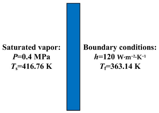 In order to accurately evaluate the effect of condensation heat transfer on a paddle dryer, the overall heat transfer process on both sides of the paddle should be considered comprehensively, instead of only the heat transfer on one side. In the present study, the condensation on the surface of the vertical plate was simulated with the third-kind boundary condition set at the other side of the plate, where the sludge temperature and heat transfer coefficient of the sludge side was given. The heat transfer coefficient of the sludge side was determined to be 120 W·m−2·K−1, according to typical experimental results in the literature [21]. The sludge temperature (working medium temperature) was selected as 363.14 K. For the vapor-condensing side, the inlet boundary condition was set as the inlet pressure boundary, where the inlet pressure and steam temperature are given. All the parameters were set as the actual operation parameters of a paddle dryer produced by Green Water Co. Ltd. in Lishui city, China. The reference pressure of the calculation domain was set as 400,000 Pa, the corresponding saturation temperature was 416.76 K, and the inlet temperature of steam was 423.15 K. The inlet steam volume fraction was set as 1. Since the steam velocity was very low in the interior of the paddle, it could be assumed that the steam velocity was 0 in the present simulation. Additionally, the other boundary conditions were set to wall boundary conditions. The boundary condition settings are given in Figure 4.