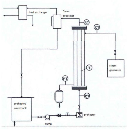 In the present study, the VOF model combined with the Lee model was used to simulate the condensation heat transfer on the surface of a vertical plate, which had been validated to agree well with the experimental data inside the tube in Ji et al.’s study [18]. In order to further verify the applicability of the above method for simulating condensation heat transfer on the outer surface, experimental data from Li’s study [20] were selected to validate it. The schematic diagram of the experimental set-up is given in Figure 5. The test section of this experiment was a vertical double-pipe heat exchanger. The saturated steam flowed into the tube from the upper end of the heat exchanger and condensed on the surface of the inner tube. The inner tube was made of brass, with the diameter, wall thickness, and effective heat transfer length of 32 mm, 3 mm, and 1800 mm, respectively. The inner diameter of the outer tube was 70 mm, which was much larger than that of the inner tube. A total of 4 test cases were calculated by CFD for verification. The test conditions of these cases are given in Table 2.