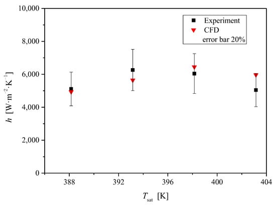 A comparison between the experimental data and the calculation results is shown in Figure 6. It can be seen that the condensation heat transfer coefficients outside the vertical tube calculated by the present CFD model were in good agreement with the experimental data, with the deviation within 20%. It indicates that the CFD method used in the present study for the simulation of condensation heat transfer was reliable.