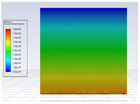 In the present study, the effect of surface wettability on condensation heat transfer was first analyzed. By setting different contact angles for the condensation surface, filmwise condensation and dropwise condensation could be realized. When the contact angle was set as 180 degrees, the condensation mode was film condensation, and the wall surface was covered by a layer of liquid film. Figure 7 presents the front view of the condensation surface to show the liquid film distribution when filmwise condensation occurred. The rotational angular velocity was set as 0 since only the effect of the contact angle was studied in this section. It was found that the liquid film was thinnest at the top of the vertical wall, gradually increasing along the vertical downward direction, and was thickest at the bottom. The reason for this phenomenon was the impact of gravity. Since the local heat transfer coefficient was inversely proportional to the liquid film thickness in filmwise condensation, the heat transfer coefficient and heat flux also increased with an increase in the axial height. The present simulation results for filmwise condensation were in keeping with the previous CFD study [11]. It indicated that the present CFD model could properly simulate the condensation process on a vertical surface.