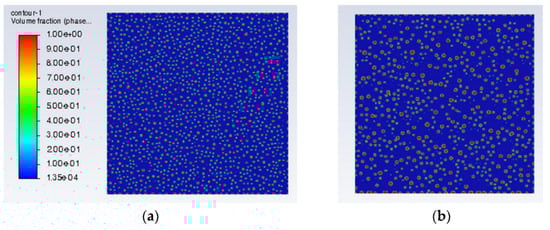 Droplet movement and distribution against time at a rotational angular velocity of 3.14 rad·s−1 and contact angle of 90°: (a) 0.2 s; (b) 0.3 s.
