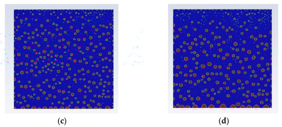 Droplet movement and distribution against time at a rotational angular velocity of 1.57 rad·s−1 and contact angle of 90°: (a) 0.2 s; (b) 0.3 s; (c) 0.4 s; (d) 0.5 s.