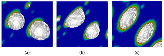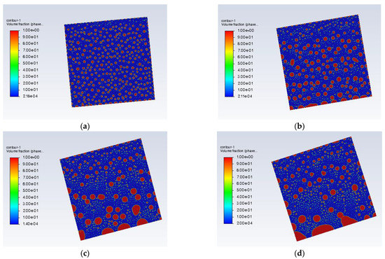 The droplet movement and distribution at a rotational angular velocity of 1.57 rad·s−1 and contact angle of 90° is given in Figure 11. This rotational angular velocity was in accord with that of the actual paddle dryer. The rotation direction was counterclockwise and the rotation center was set at the geometric center. It was observed that the vapor randomly condensed on the whole wall surface. Owing to the effect of surface tension, the droplets with small size gradually increased and moved downward under the effect of gravity, accompanied by the process of coalescence among different liquid droplets. Compared to the case without rotation, it was found that droplet coalescence grew greater and the droplet size was much larger at the same time. The possible reason for this phenomenon was that the effect of rotation led to the local relative slip of droplets and enhanced the chance of droplets contacting and coalescing. In addition, the droplets tended to accumulate at the lowest location of the vertical wall owing to the effect of gravity.