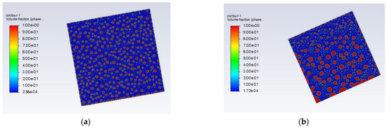 Figure 12 shows the variation in droplet distribution in dropwise condensation against calculation time at a rotational angular velocity of 3.14 rad·s−1 and contact angle of 90°. The rotation direction was counterclockwise, and the rotation center was set at the geometric center. Similar droplet movement behavior can be observed in this figure, in that the droplets tended to move along the direction of gravity. There was no essential difference in droplet distribution found in the present study when the rotational angular velocity increased from 1.57 rad·s−1 to 3.14 rad·s−1.