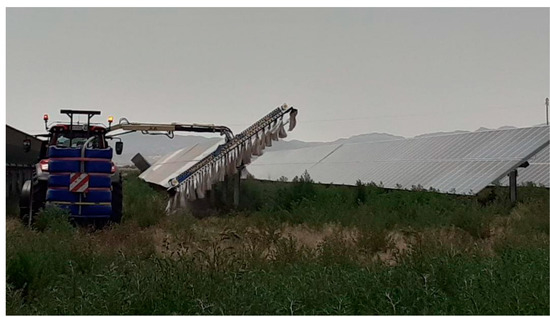 Tractor-operated traditional cleaning method in a large PV power plant.