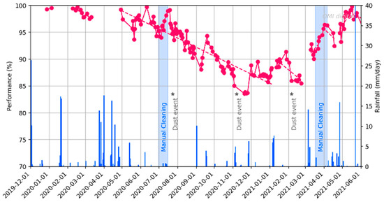 Previous studies have found that 5 mm/day of rainfall is enough to clean photovoltaic modules for up to 0.5% of soiling [30]. However, the analysis of the five PV power plants showed that some locations required significantly more rainfall to clean completely the modules. Figure 3 shows the measured efficiency of a PV power plant in Spain and the local precipitation for one and a half year. The performance (%) on sunny days at midday is represented in magenta. Blue bars represent daily precipitation (mm/day). Manual cleaning events and dust events (Saharan dust) are also indicated in the figure. The daily precipitation data used in this study were accessed via an API from the AEMET (Spanish National Meteorology Agency) OpenData database [31].