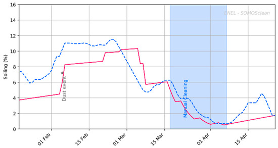 In small power plants, manual cleaning can be well characterized, considering that the soiling level (SL) is 0% after the cleaning is performed. This process is similar to a heavy rain, as shown in Figure 3. However, in large PV plants, the cleaning activity can last for several weeks. Some panels are cleaned first and others later, resulting in a different degree of soiling in each area of the plant. For the estimation of the degree of soiling in the whole plant (for instance for soiling losses calculation), a gradual decrease from day to day should be considered. This can be observed in Figure 4.