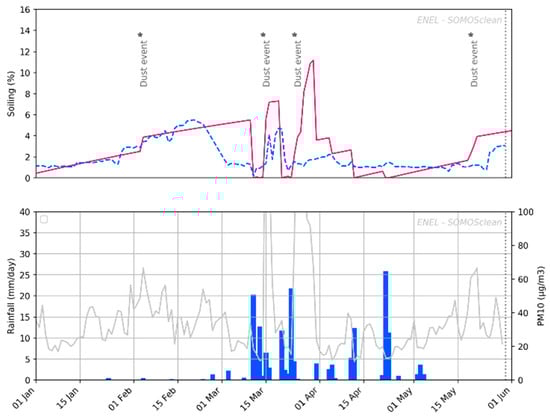 Upper plot: Soiling model (magenta line) and soiling sensor output (dashed blue line). Lower plot: Rainfall (mm/day) and PM10 concentration (µg/m3).
