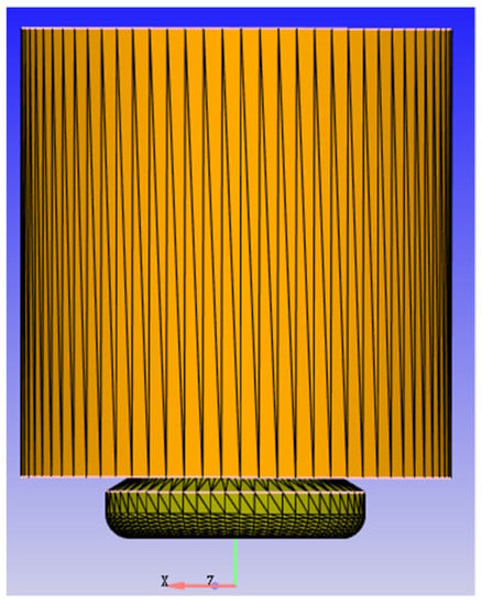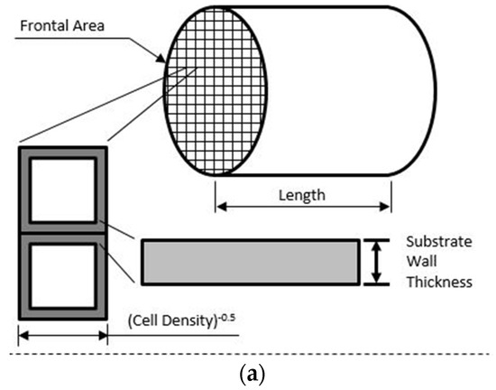 In addition to the research focus on ammonia–diesel dual-fuel engines and high NOx emissions, the emission of unburned NH3 is also a big challenge due to the toxic and corrosive properties of ammonia. In order to explore the reduction effect of the remaining NH3 on NOX in the cylinder under the coupling of SCR aftertreatment technology, the SCR aftertreatment model built by Li et al. [45] was coupled to the above ammonium–diesel dual-fuel engine. The evolution of NOX without adding ammonia to the SCR system was analyzed. GT-power is used to establish the SCR quick-reaction kinetic model based on the reaction mechanism of Pant’s Cu-based zeolite [46]. The model is based on the following assumptions. (1) When calibrating the SCR model, to simplify the model processing, gaseous NH3 is directly injected into the reactor without considering the spray and hydrolysis process of urea solution. The SCR reaction is described by the E-R mechanism [47], which considers that the response occurs between adsorbed NH3 and NOx in gas phase or weakly adsorbed state. The physical model of the SCR is shown in Figure 3. The model parameters are shown in Table 5, and the size of the model is modified based on the parameters mentioned earlier of the ammonia–diesel dual-fuel engine.