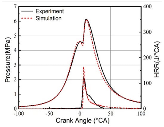 To consider the calculation accuracy and efficiency, after analyzing the grid sensitivity, the actual grid size is set to 2 cm, the minimum grid size for local refinement is 5 mm, and an adaptive mesh refinement (AMR) based on velocity and temperature is added. The maximum number of calculation grids is about 1.2 million, which can realize efficient and high-precision calculation. Figure 2 shows the comparison of cylinder pressure and heat release rate calculated by experiment and simulation; the experimental data are from the study of Niki et al. [44]. The red dotted line represents the cylinder pressure and heat release rate in the three-dimensional simulation, while the black solid line represents the cylinder pressure and heat release rate in the experimental results. The cylinder pressure was measured by a pressure transducer with a charge amplifier (Kistler 601 A and Type 5011). The cylinder pressure was measured every 1 crank angle degree and averaged 50 engine cycles. The gas analyzer measures multi-gas components at the same time. This analyzer can sample the hot exhaust gas. Its sampling line and sapling filter are heated to 191 °C. Thus, the NH3 in exhaust gas containing H2O can be detected precisely. The maximum burst pressure of the experiment is 6.2 MPa, the simulated value is 6.03 MPa, and the error is 2.7%; The crankshaft rotation angle corresponding to the experiment CA50 is 12.6 °CA, the simulation value is 10.05 °CA, and the error is 2.55 °CA. Under this condition, the experimental NO emission is 662 ppm, the NO emission predicted by the model is 573.6 ppm, and the error is 13.3%. Because the model can only reflect the results of the experiment to a large extent, it cannot fully present the results of the experiment, which is inevitable. The article cited that the prediction error of pollutants in the calibration content of the aftertreatment model had exceeded 10%. Generally, the prediction range of gas concentration within 15% is reasonable. Moreover, the cylinder pressure and heat release rate calculated by the simulation are in good agreement with the experimental results. That is, the model can accurately predict the actual working process of the engine and the emission of nitrogen oxides.