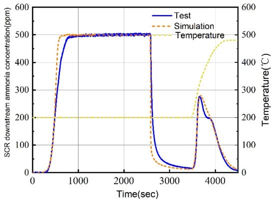 It can be seen that the NH3 adsorption and desorption reaction is an essential part of the standard SCR reaction. Therefore, the validation of ammonia adsorption and desorption is crucial. Figure 5 shows the comparison between the simulation results of the NH3 adsorption and desorption model and the experimental results; data were obtained from the experimental test, and catalyst sample test data is provided by catalyst supplier. As shown in Figure 5, it can be seen that no matter the process of isothermal adsorption, isothermal desorption, or desorption at elevated temperature by which the reaction occurs, the errors between the simulation results and the experimental data are all within an acceptable range. The isothermal process takes place from 0 to 3500 s, and after 3500 s is the heating phase. This shows that the SCR model can describe the ammonia adsorption and desorption process of the coated honeycomb SCR catalyst.