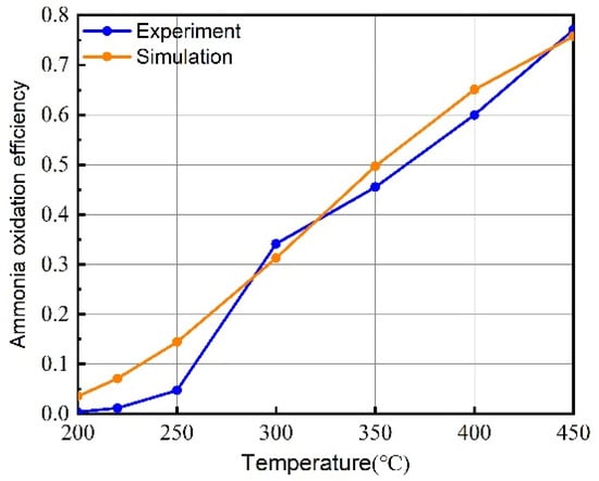 Comparison between experimental and simulation results of ammonia oxidation efficiency.