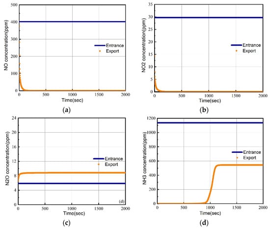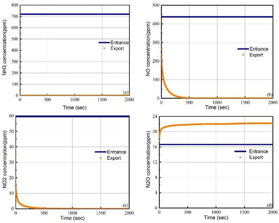 Changes in NOx and ammonia concentrations at the inlet and outlet of the SCR model before and after oxygen was introduced in Case 2. (a) NO concentration on entrance, export and ventilation with oxygen. (b) NO2 concentration on entrance, export and ventilation with oxygen. (c) N2O concentration on entrance, export and ventilation with oxygen. (d) NH3 concentration on entrance, export and ventilation with oxygen.