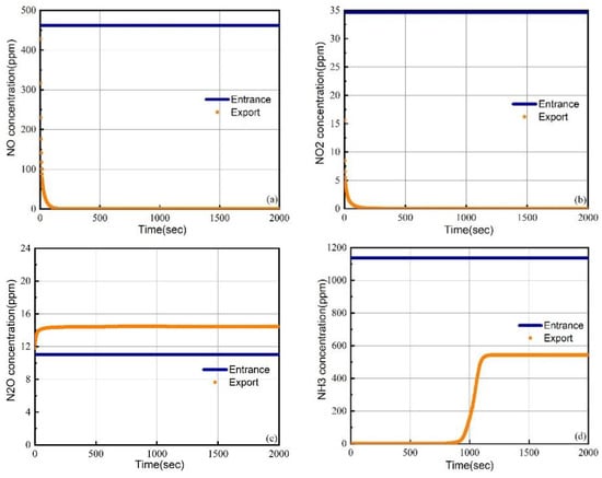 Comparison of NOX and unburned ammonia concentrations at the SCR inlet and outlet in Case 2. (a) NO concentration on entrance and export. (b) NO2 concentration on entrance and export. (c) N2O concentration on entrance and export. (d) NH3 concentration on entrance and export.