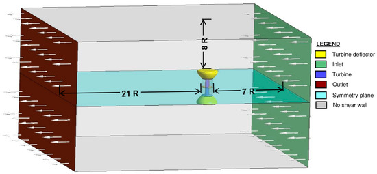 The system involves rotating parts and fixed parts which is a challenge in CFD simulations. Techniques such as MRF (mixed reference frame) are computationally reasonable but cannot predict the average torque through a single revolution. The sliding mesh method is adapted to that application but is very expensive in terms of resources and time. The number of cases and turbine rotational velocities per deflector required a thorough study on the computational time requirements. The whole domain is divided into a stationary fixed domain which contains the deflector and a rotating one. The contact region between those two domains is treated as an interface. The stationary subdomain is obtained by extracting the rotating part and the designed deflector. The rotating subdomain is then modeled and added as a separate cylinder, as seen in Figure 1. The dimensions of the computational domain shown in Figure 1 were chosen following the recommendations of El-Askary et al. [4]. Boundary conditions involve a shear-free wall on the outer walls of the stationary domain to avoid nonrealistic shear wall stress diffusion into the rotating domain. This wall acts only as a container by preventing the airflow from exiting the stationary domain. The turbine end plates, deflector, and blade are no-slip walls. A constant velocity of 7 m/s with a turbulence intensity of 5% are imposed at the inlet and a pressure-outlet condition (constant atmospheric pressure) is imposed at the outlet (see Figure 1).