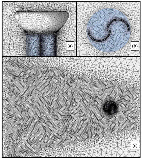 Unstructured mesh details. (a) Surface mesh on the turbine and in the median plane of the computational domain; (b) representation of the mesh in a horizontal plane around the turbine; (c) overview of the mesh around the turbine.
