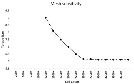 To reduce the computational expenses and the simulation time, a symmetry plane was added, as seen in Figure 1. Two symmetry faces were included in the model, with one in the stationary domain and one in the rotating domain, the latter being used to induce identical rotation in the symmetric volume. This configuration was validated by comparing the results to those obtained on whole domain simulations. Figure 2 is used to illustrate the form and size of the unstructured mesh around and over the turbine. To ensure the accuracy of the numerical analysis, the mesh independence study reported in Figure 3 was first carried out. The average torque according to the different mesh size for spline 1 was stabilized for 2.2 million cells. As seen in the Figure 3, the variation of the average torque was held at 4% for the 2.2. It should also be noted that the simulation time was almost 3 times longer with a 4 million cell mesh, which was clearly not feasible in the frame of the study. The selected mesh was therefore a compromise between computational cost and accuracy. The unstructured mesh was generated using ANSYS 2020 R2 meshing software. It consists of about 2.5 million tetrahedral cells regardless of the case studied.