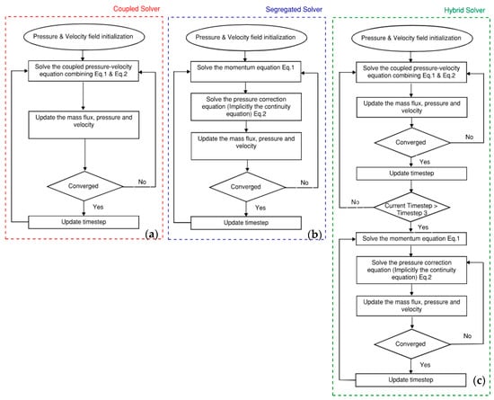 Solver’s algorithms. (a) Coupled solver; (b) segregated solver; (c) hybrid solver.