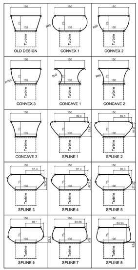 The deflector used as a benchmark in this study is the one developed by Aboujaoude et al. [7] in Figure 5, referred to as the “old design”. The profile consists of a three-dimensional truncated cone. Although the mounting system of the deflectors is not represented, it is thought to be completely dissociated and independent from the turbine structure. To study the geometric shape impact of the deflector faces on the turbine performance, three concave-, three convex-, and eight spline-shaped deflectors cases are proposed and presented in Figure 5. All the spline cases have the same deflector volume, which equates the volume of the convex 1 case. All 3D transient CFD simulation runs are performed by imposing 5 different turbine rotation speeds defined below by the tip speed ratio λ. The developed torque curves and averages through the different velocities are monitored and stored for comparison purposes. On the other hand, the total force combining the drag and the lift applied on each deflector is also monitored to study the impact of the geometrical shapes on the structural fatigue and stability.