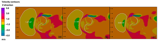The velocity contours maps of Figure 7 illustrate the diverting capacity of each of the deflectors. Indeed, at the inlet side of the rotor, the negative value contours (yellow, green, and blue) show the extents of the wind deviated down to the turbine. As seen in Figure 7a–c, the deflection capacity of the three cases are measured as negative velocity areas at the inlet of the turbine, and it is clear that the spline 1 case deflector has the best performance, followed by spline 8 and then the old design case. Figure 8a–c shows the velocity contours and, more precisely, the flow separation point, which has a key role for fluid flows around obstacles. The flow separation in the spline 8 and old design cases occurs upstream the turbine in contrast to the spline 1 case, where we see separation downstream the turbine. Figure 8d–f shows the recirculation zones and eddies downstream the turbines for all cases. On the other hand, it also shows the eddies created on the top and downstream the deflector for spline 8 and old design configurations. The results show us that the recirculation zones generate a local decrease in velocity. The recirculation zones are particularly visible in Figure 8d–f downstream of the turbine but also above the deflector for the spline 8 and the old design deflector. The results show us that the flow is strongly decelerated downstream of the separation point, which is particularly noticeable for the spline 8 and the old design deflector. To appreciate and compare the deflector convergence capacities in the simulated cases, streamlines plotted from the interface in backward and forward schemes seem to be an appropriate parameter. Indeed, being a line that is tangential to the instantaneous velocity direction, it helps visualize the flow or the motion of a small, marked element of fluid. A sensitivity test was carried out on the number of points specified on the rotating interface, and beyond 500 points, the measured height defined in Figure 8g–i is stabilized. This measured height also shows an increase in the diverting capacity when using the spline 1 deflector as reflected also in the averaged torque results shown in Table 2. Considering the spline 1 and spline 2 cases and as shown in Figure 5, the geometrical shapes appear to be quite similar, while the spline 2 and spline 8 cases are considerably different. However, when comparing the performances through the average torques, spline 1 has greater performances, while spline 2 and spline 8 perform quite similarly. This relays the importance of thorough optimization of wind deflector shapes where small geometrical variations could imply substantial gains. Finally, the air flows more easily along the spline 1, which has a rounded edge. This deflector shape allows the airflow to be directed favorably toward the turbine, which consequently increases the torque. Figure 8 suggests a close link between aerodynamics and cyclic force variation. These results suggest that the more aerodynamic the shape of the deflector, the lower the drag forces will be, resulting in less structural fatigue.