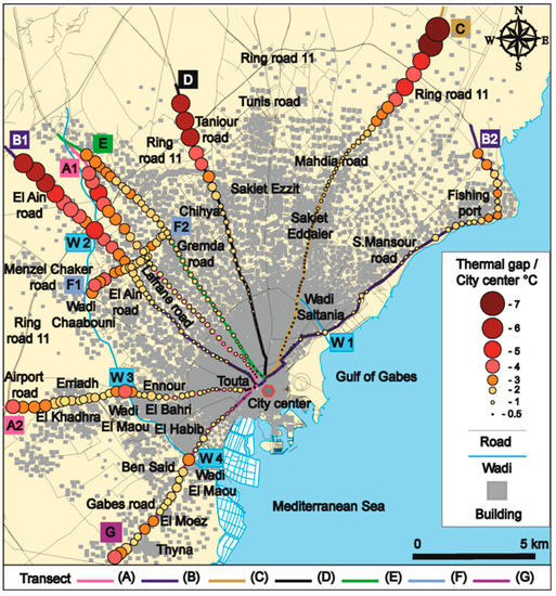 Similarly, significant decreases were recorded next to other wadis crossing the conurbation, at the level of the roads of Sidi Mansour (transect B2, WadiSaltania W1), El Ain (transect B1, Wadi El Ain W2) and Wadi El Maou, which passes by the roads of the airport (transect A2, W3) and Gabes (transect G, W4). The most significant decreases were recorded next to Wadi El Ain (W2) and Wadi El Maou (W3) (Figure 2). Passing through Wadi El Ain talweg (transect B1), at the level of point W2, surrounded by generally open areas adjacent to Ring Road 11, the thermal difference observed compared to the city centre reached 5 °C (Figure 2). Similarly, at the level of the bridge crossing Wadi El Maou (point W3), which is densely vegetated and located about 5 km from the Medina on the airport road (axis A2), we calculated differences of about −2.5°C in comparison to the neighboring built-up areas and −4 °C in comparison to the city centre (Figure 2).