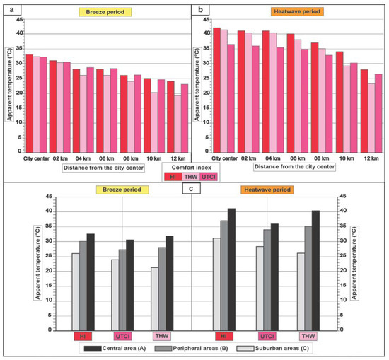 (a) HI, UTCI and THW comfort indices calculated between the central part and 12 km from the city centre in breezy weather; (b) in hot weather (Sirocco); (c) HI, UTCI and THW comfort indices calculated in areas A, B and C in breezy weather and hot weather (Sirocco) during night.