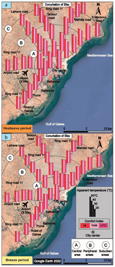 The HI, UTCI and THW comfort indices, calculated based on the repeated mobile survey campaigns covering the whole of the conurbation of Sfax and conducted in all directions, indicate that the temperatures felt in the city of Sfax vary essentially according to the urban density, the distance from the coastline and the type of weather (Figure 3).