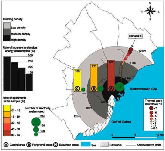 Spatial distribution of building density, number of electricity meters used, rates of apartments in the samples used in areas A, B and C and percentages of the average increase in electrical energy consumption in the conurbation of Sfax between the months of May and August 2018.