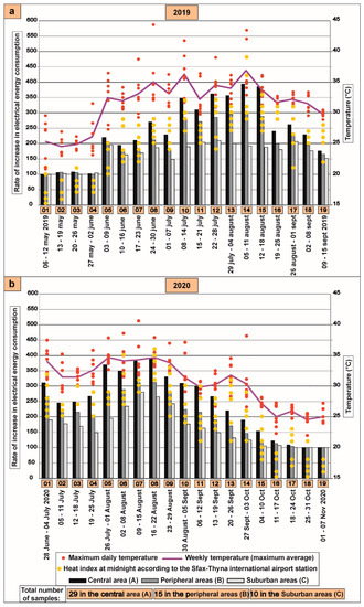 (a) Weekly average increase in energy consumption for air conditioning calculated between 6 May and 15 September 2019; (b) weekly average increase in energy consumption for air conditioning calculated between 28 June and 7 November 2020. The daily maximum temperatures and weekly maximum averages were recorded and calculated during the same periods as the weekly consumption monitoring mentioned above.
