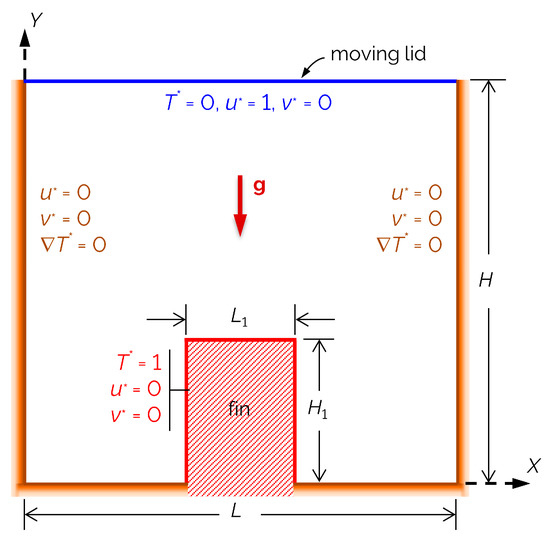 The considered problem is a CuO-water nanofluid flow in a cavity with a rectangular fin intruded from the bottom surface, which is adapted from Ref. [1], and the schematic diagram of the domain is shown in Figure 1. This geometry can potentially be applied to many engineering applications, where an extended surface or fin is used for enhancing heat transfer. For example, it can be used for electronic cooling for faster heat removal, increasing heat transfer performance in solar collectors, and cooling of nuclear rods in a nuclear power plant by improving the functionality of the existing system. The present geometry includes symmetrical conditions at the left and right surfaces. The top wall moves along the x-direction, while it maintains a constant temperature (Tmin). The rest of the surfaces are stationary, thus u* = 0 and v* = 0 (dimensionless velocities in x- and y-direction, respectively). The fin area has been defined with a constant but higher temperature of Tmax, with an area of Af, length of L1, and height of H1. The whole geometry has a length of L, a height of H, and an area of A. All surfaces, except the top one, are defined as adiabatic, and the no-slip condition is applied. The chosen nanofluid is considered Newtonian and incompressible, and the radiation effect has been neglected.