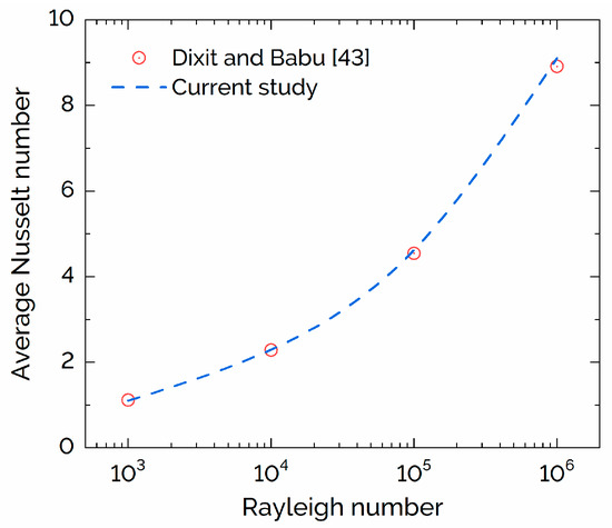 Estimated average Nusselt number of the present study with the benchmark solution of Dixit and Babu [43].