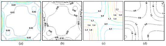 Comparison of local entropy generation contours caused by heat transfer irreversibility (a,b) and caused by fluid friction (c,d). Parts (a,c) show the obtained data, while parts (b,d) show the literature data [6]. Parts (b,d) are reprinted with permission from Ref. [6]. 2008, Elsevier Ltd.