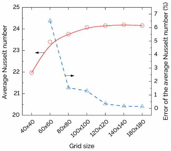 The 180 × 180 gives a bit lower Nusselt number value than the previous one, probably due to an error of the system, as it is expected to be a bit higher than 140 × 140, while it takes a longer time for the simulation to run. Therefore, the ideal choice stands between mesh grid sizes of 120 × 120 and 140 × 140; where 140 × 140 is chosen as it produces the most accurate results, and the percentage of error is less than 0.2%. Although the chosen mesh size requires a higher computational time, the results must be accurate. In addition, Figure 4 shows the percentage (%) in the error of the Nusselt number for all the cases, which is quite low for mesh sizes higher than 100 × 100.