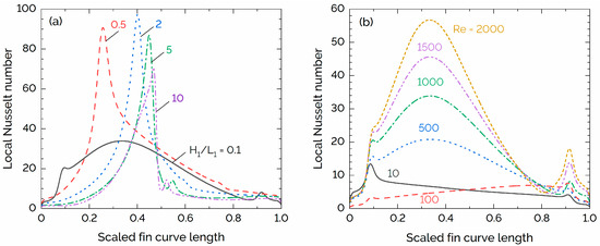 The local Nusselt numbers (Nul) for various fin aspect ratios (AR = H1/L1) and Re values are presented to demonstrate the effect of the fin aspect ratio on local heat transfer (as shown in Figure 5). Here, Figure 5a shows Nul for Re = 1000 and Figure 5b shows Nul for AR = 0.1 along the scaled fin curve length for the base case parameters. It is noticed in Figure 5a that the left side of the fin surface provides higher Nul and the right side provides lower Nul due to the directions of forced and natural convection. Both forced convection and free convection are acting in the same direction on the fin’s left side and in the opposite direction on the fin’s right side. The spikes in each line are at the two top corners of the fin, except for AR = 0.1, where the highest peak indicates the fin’s top surface, and the two smaller peaks at the two ends of the curve are for the fin’s top two edges. The maximum value of the local Nusselt number (Nul,max) increases with the fin’s AR as it changes from 0.1 to 0.5. However, Nul,max is lower for AR = 10 and higher for AR = 0.5. Additionally, Nul at the fin’s right side is lower for AR = 10 compared with the other ARs. Here, the directions of the forced and free convections are opposite on the right side and the cavity is almost divided into two smaller cavities by the fin, where the applied inertial force is acting on the right half of the cavity. Thus, the downward motion of the nanofluid is stronger on the fin’s right side for AR = 10, which prevents warmer fluid to rise. Additionally, at the lowest AR, only a small portion of nanofluid over the fin’s top surface is disturbed by the inertial force; conversely, at the highest AR, the fin penetrates the cavity and separates the convection in two parts making it less efficient and reducing the heat transfer.