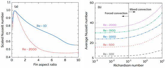Effects of inertial and buoyancy forces. (a) Scaled Nusselt number as a function of fin aspect ratio for Re = 10 and 1000, and (b) average Nusselt number as a function of the Richardson number for several Reynolds numbers.