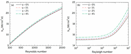 The convective heat transfer coefficient (hnf) has been further analyzed for four values of nanoparticle concentrations. The results are shown in Figure 8. These results confirm that the convective heat transfer coefficient enhances, as the concentration of CuO-nanoparticle increases. To be specific, at a higher Reynolds number about 4.5% higher hnf can be achieved with a 4% CuO-nanoparticle concentration, while the thermal conductivity of nanofluid increases by about 11% for the 4% particle concentration. However, the percentage of change in the low Re number is higher, which is about 8% at Re = 100. This indicates that nanofluids bring a higher benefit in the mixed convective scenario than in the forced convection case. This is better visualized in Figure 8b, as we see that the changes in hnf are higher at higher Ra numbers. These results provide further insight into how CuO-water nanofluid can be utilized for enhancing heat transfer for engineering applications where mixed convection performs a critical role.